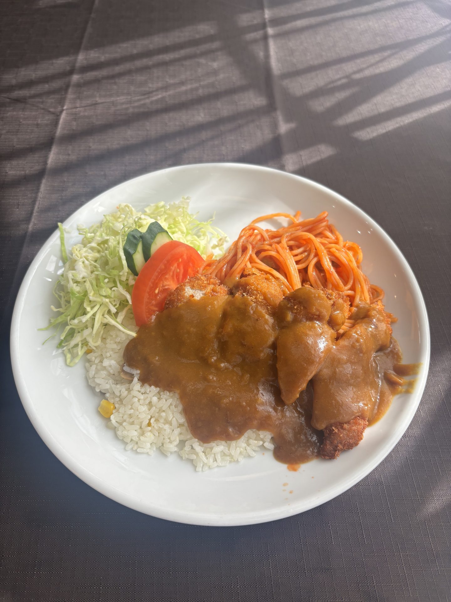 ピラフの上にカツとカレー、ケチャップベースのスパゲッティという、お子様ランチのようなワクワクするメニューたち。一見重そうに見えて、不思議とぺろりと食べられてしまいます。