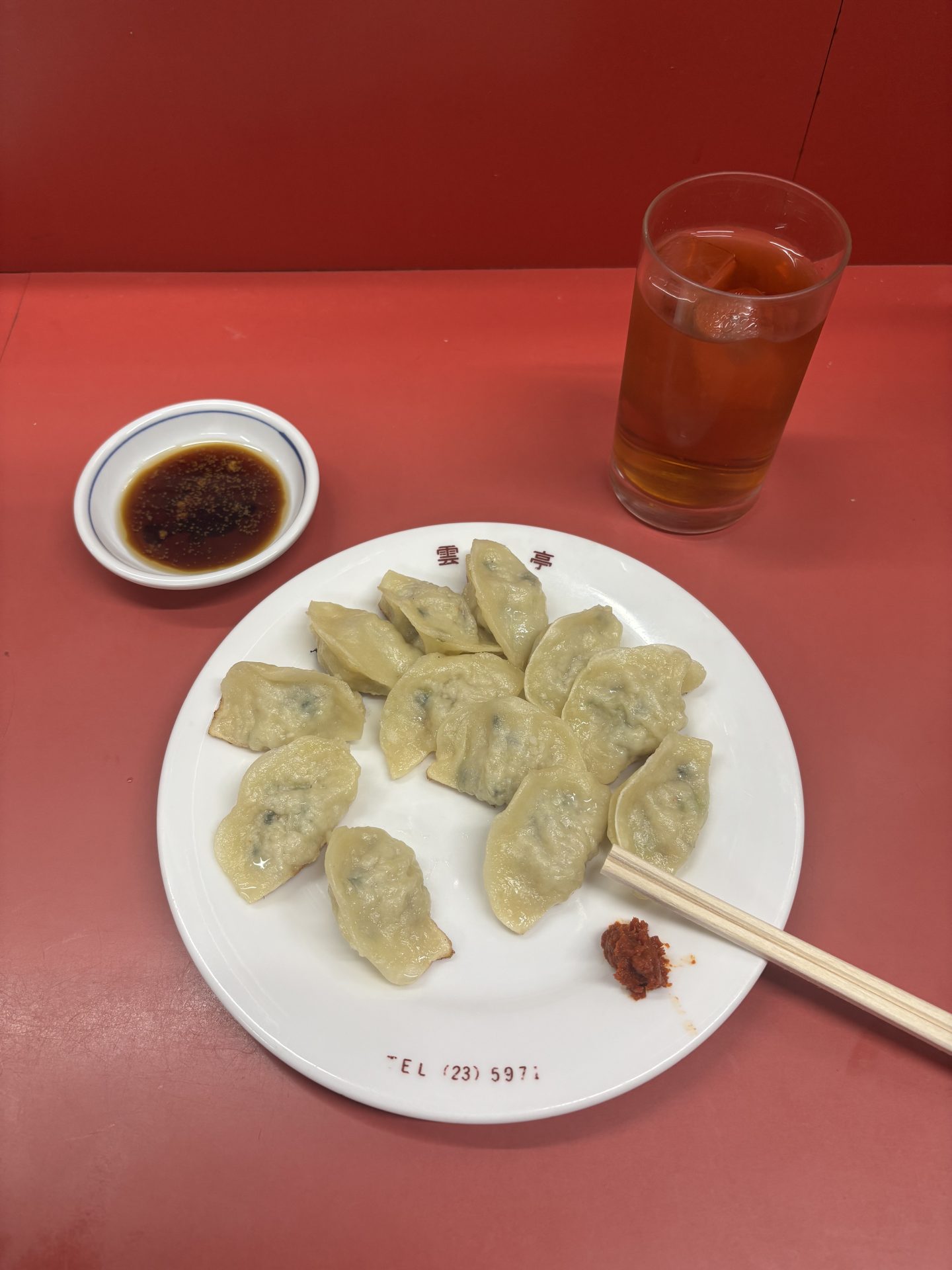 ころんとしたかわいいサイズの餃子を、赤い柚子胡椒でいただきます。スナック菓子のようにパクパク食べられる軽さ、柚子胡椒のピリッとした辛味がきいていて、箸が止まりません。