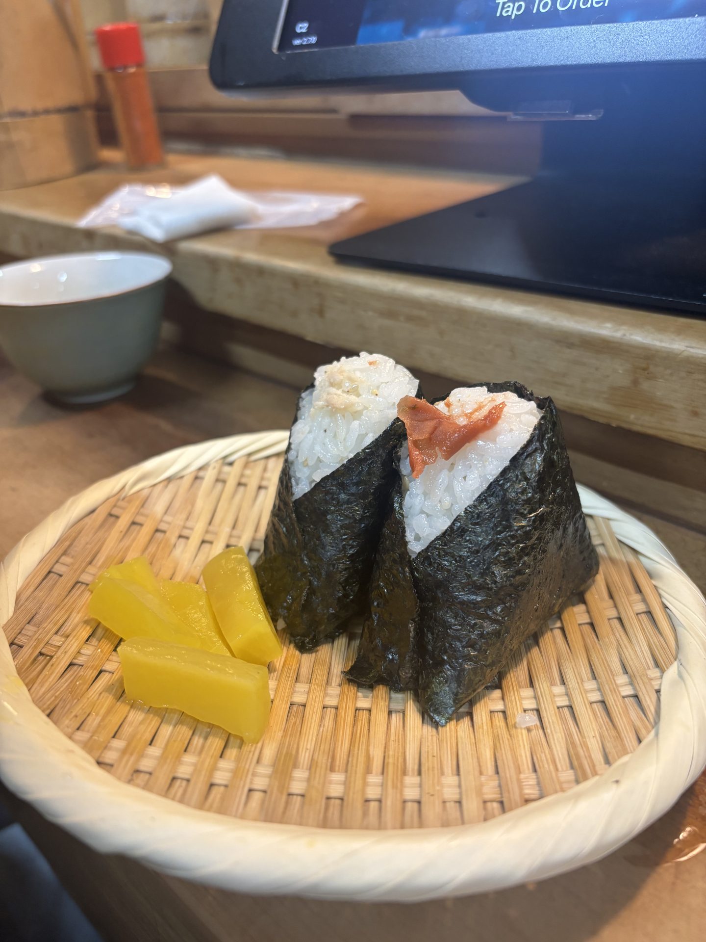 この日はかなり食べ飲みしていたので、おにぎりまで辿り着けるか……と心配していましたが、食べやすい小ぶりサイズで、お米はふわふわの軽い食感。何個でも食べられてしまいそうでした。漬物と一緒に、ざるに乗っているところもまた食欲がそそられます。東京でも締めのおにぎり文化が広がってほしいですね。