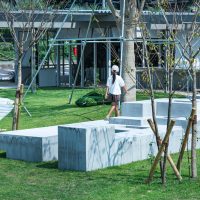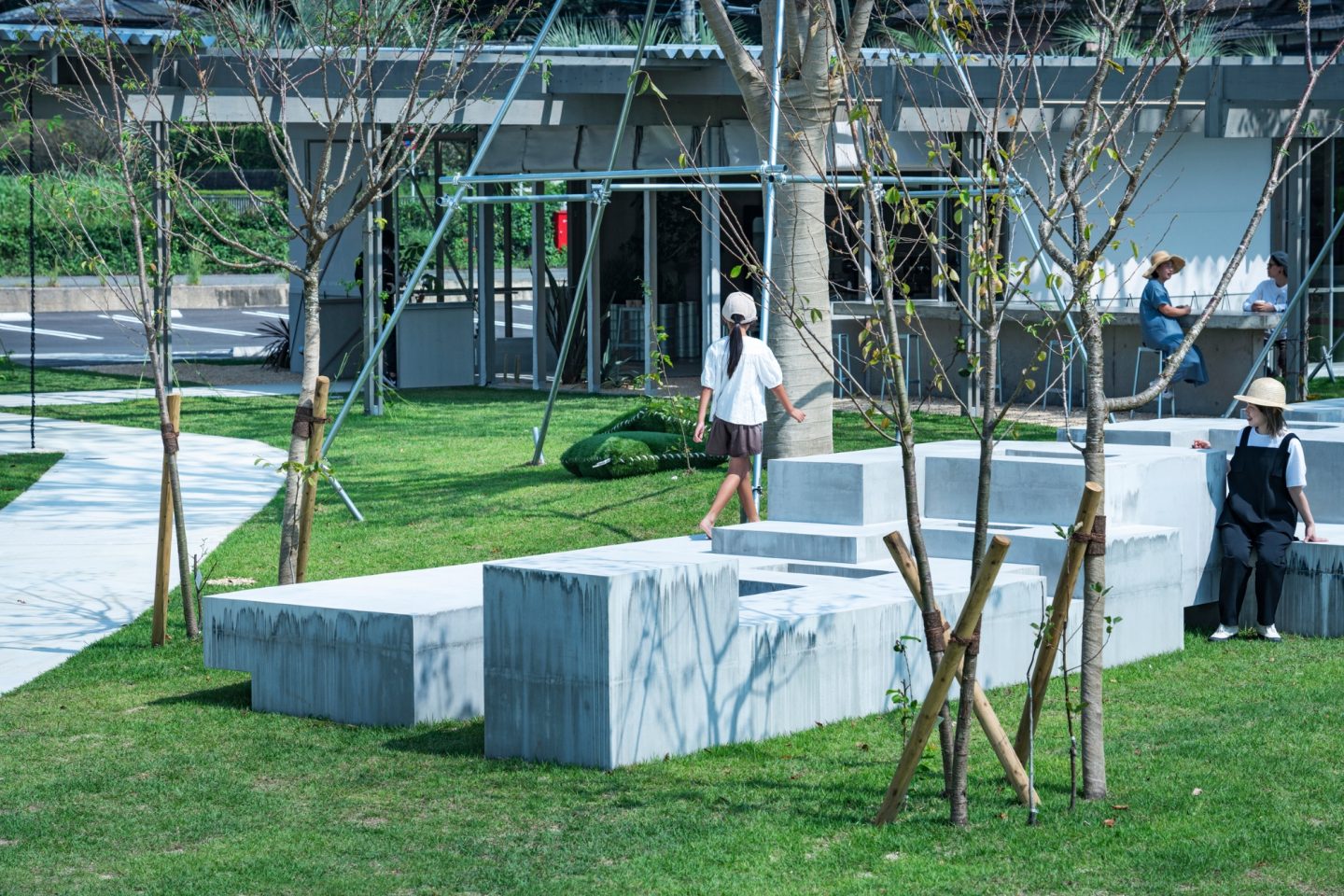 芝生広場とショップが共存する私設公園