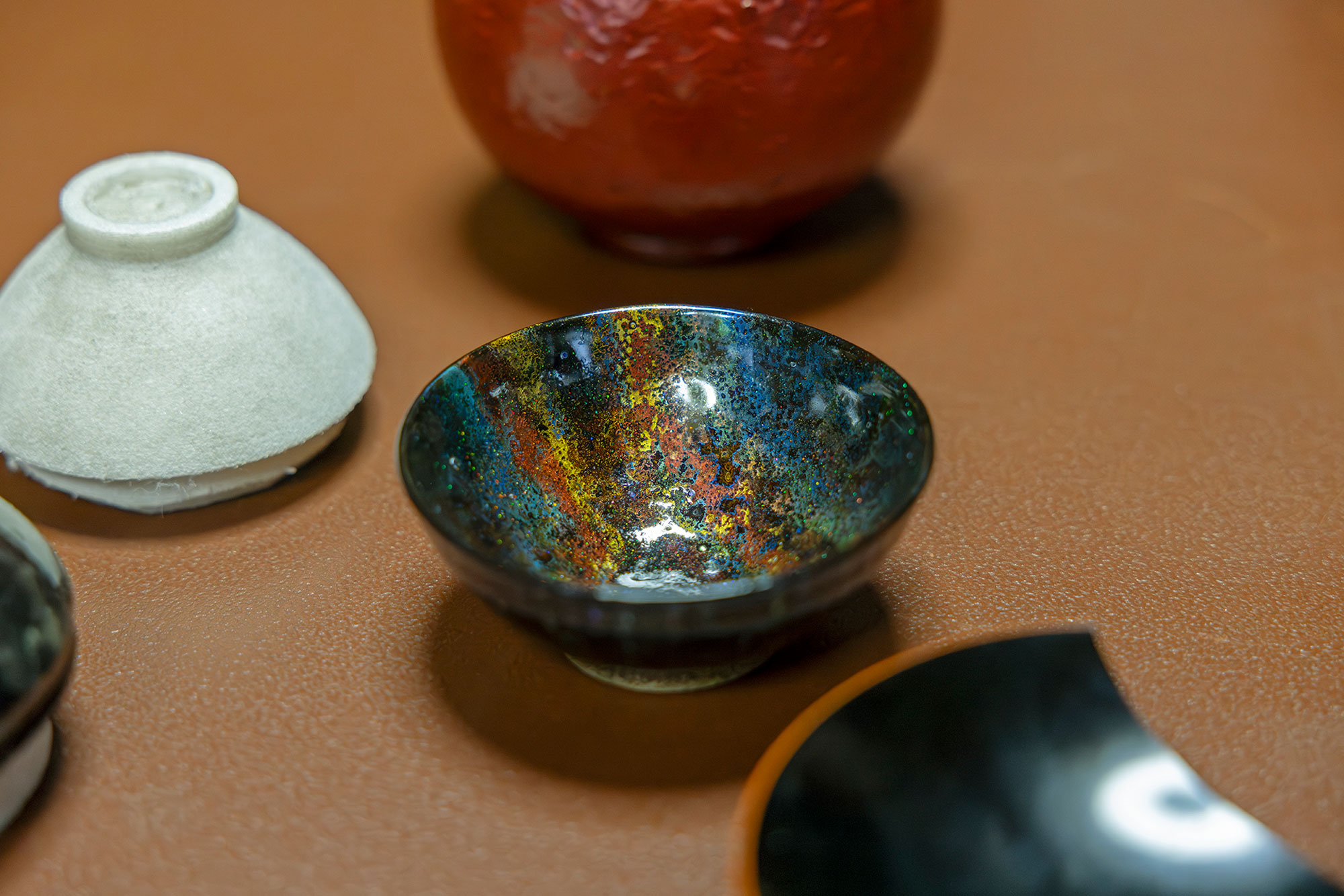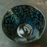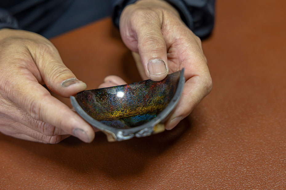 「塗っては研ぐことを繰り返すことで、いろんな層で反射して、奥行きが生まれるのです。それと加飾といって、絵付けのような作業をしているのですが、漆を塗る過程で金や銀、プラチナ、オパール、ダイヤモンドなどの鉱物を入れています。おっしゃる通り、お酒を入れると偏光性が増して、器の中に宇宙を見ているような感覚になりますよ」(松堂さん)