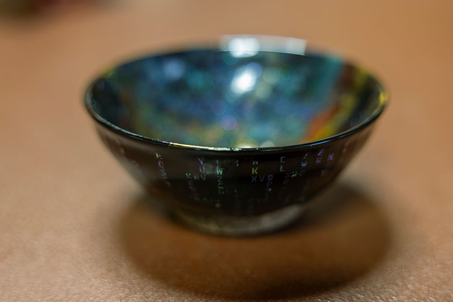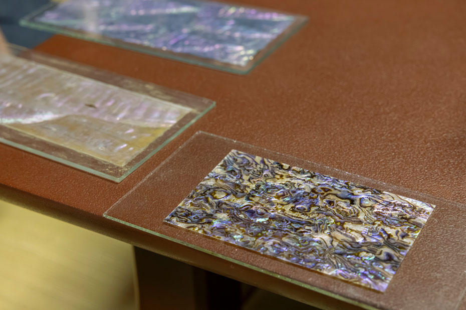 「貝殻を用いた螺鈿(らでん)という装飾技法なのですが、なぜアルファベットにしたかというと、アルファベットの26文字はそれぞれ宇宙の物理法則を表しているのです。僕は昔から宇宙というものに憧れや興味があって、漆を使ってそれらを表現するのがライフワークになっているんです」(松堂さん)