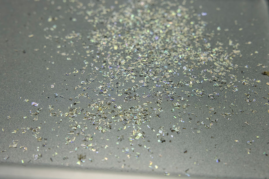 「このサイズを手作業で切り出すのは無理なので、レーザー加工機で型抜きしています。切り出したアルファベットはすべて使えるわけではなく、緑や青、赤などの色味や模様のバランスを考えて配置していきます」(松堂さん)
