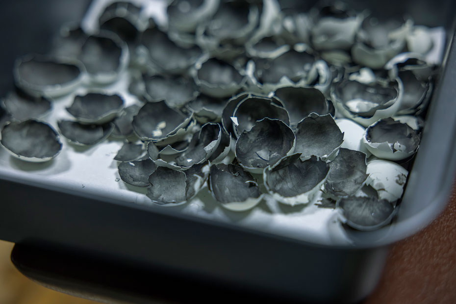 「新たな仏像をつくりたいのですが、年齢的にも厳しくなると思うので、途中までつくりためてきたこの鳥をすべて生かしてあげたい。モザイクの手法を取り入れているのですが、白は漆で出せない色なので、うずらの卵の殻を使っているんです。これも、誰も見たことがないでしょう?」(宗陽さん)
