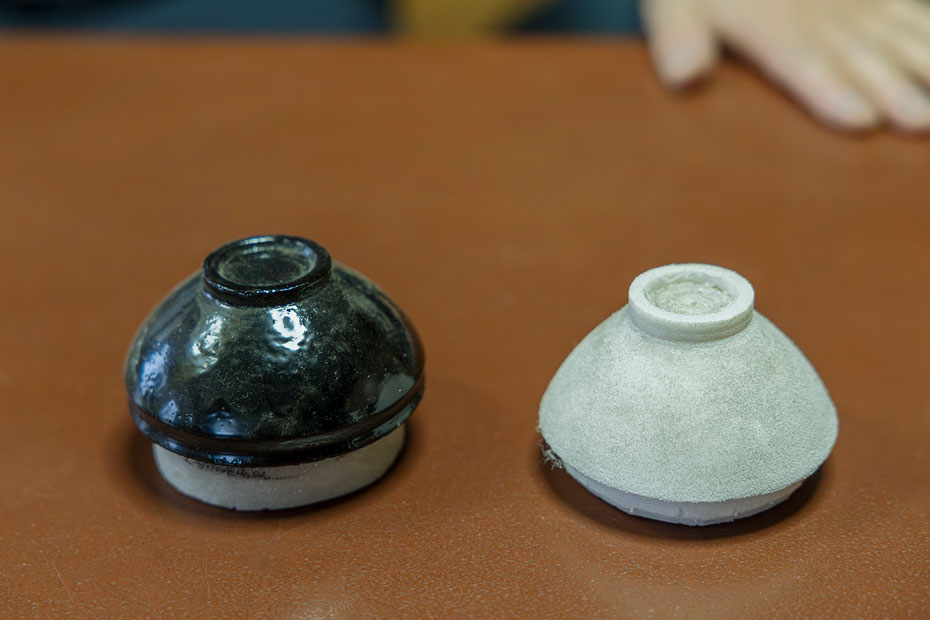 「発泡ウレタンを型として使っています。木地は表面を漆ですべて覆い、内部に隠れてしまうものですが、発泡ウレタンはあくまでも型なので、この上に漆を塗って研ぐ作業を何度も繰り返します。そして厚みが出てきて型を取り外すと、漆の部分だけが残るのです」(松堂さん)