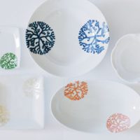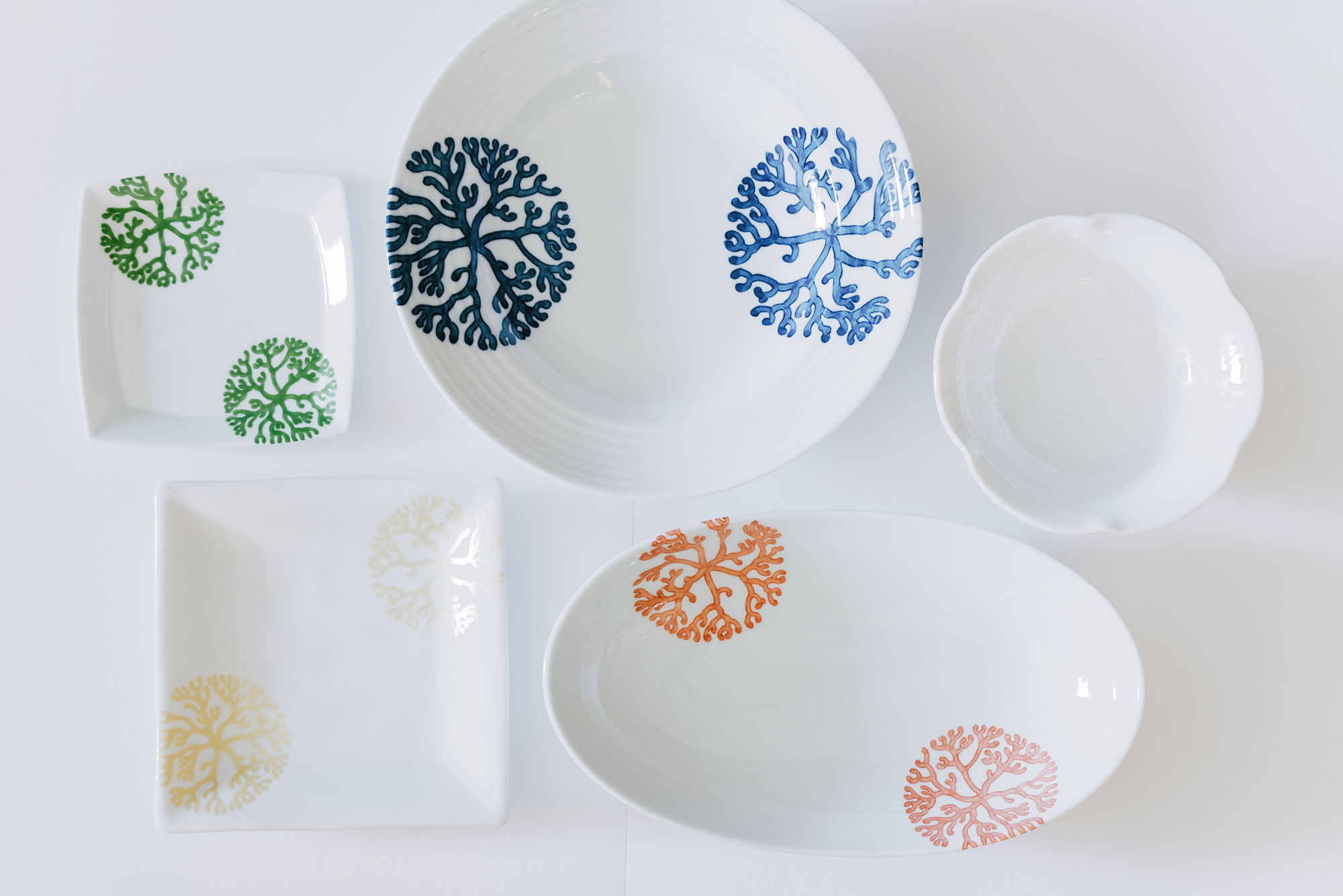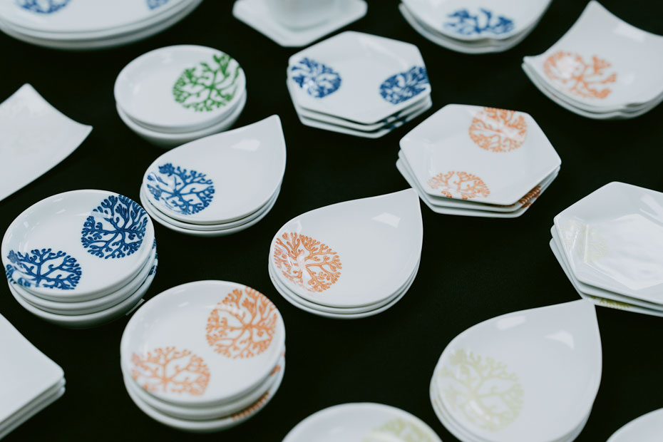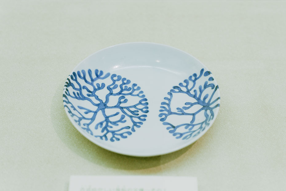 陳列するアイテムのなかで、ひときわ目を引くのが、花のようにも樹木のようにも見える模様の入った食器。真っ白な磁器に、青や緑、ピンク、ゴールドなどさまざまな色で施され、華やかさがプラスされています。
