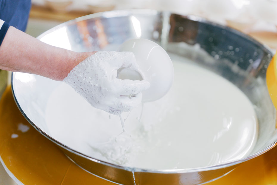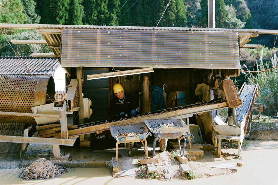 天草陶石の特徴である焼き上がりの白さは、鉄分の少なさによるもの。採掘された陶石は、ひとつひとつ手作業で等級分けされ、鉄分の少ない白い石ほど高級なものとして扱われます。陶石はその後、陶土をつくる業者に渡され、各窯元の希望に沿った調合で陶土がつくられます。