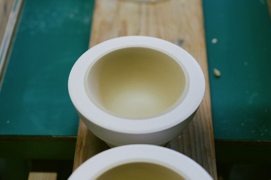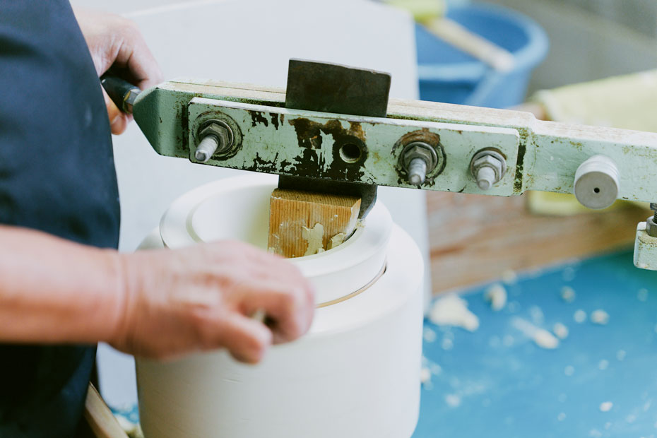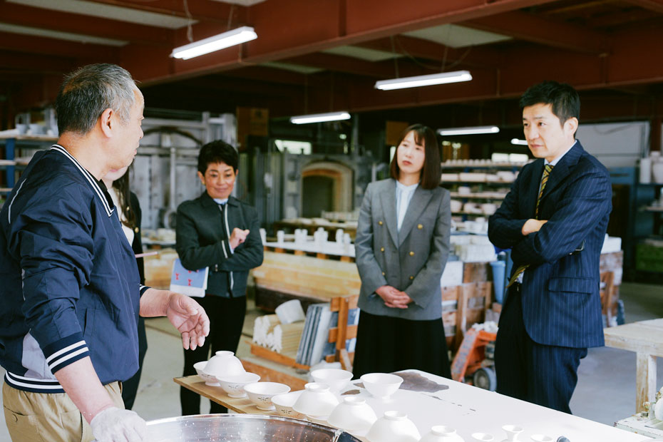 高浜焼の製造工程も見学させてもらいました。磁器の量産に欠かせないのが、石膏型を使った成形。生地を石膏の型に流し込んで均一な形をつくっていくのですが、ほかにもふたりが注目したのは、水ゴテ成形と呼ばれる作業。茶碗やカップなど深さのある器に適した、ろくろと石膏型を組み合わせたような成形方法で、あっという間に形や厚みを整えていく職人技に、目を見張ります。