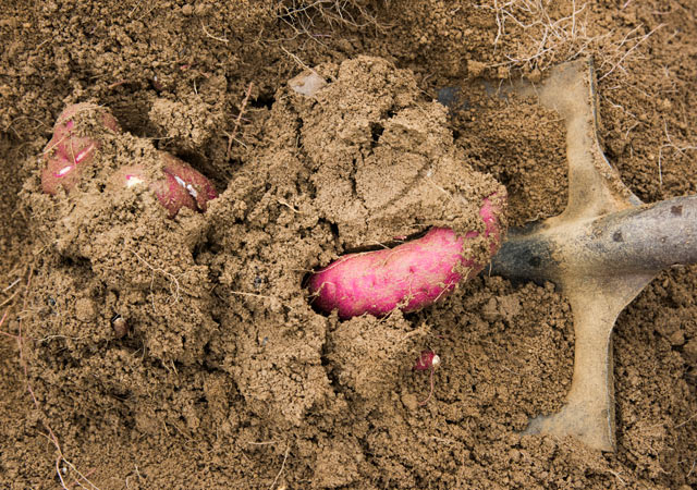 まず、さつまいもが埋まっている周りのうねを崩していく。すると、赤い色のさつまいもの断面が見え始めた。スコップを差し込み、てこの原理でぐいと持ち上げる。すると、ずるずるっと連なった芋が表にお目見えする。