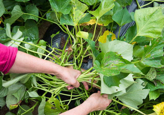 遠くのほうでは、信子さんが芋づるを収穫している。