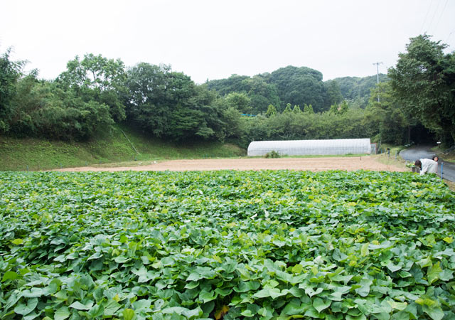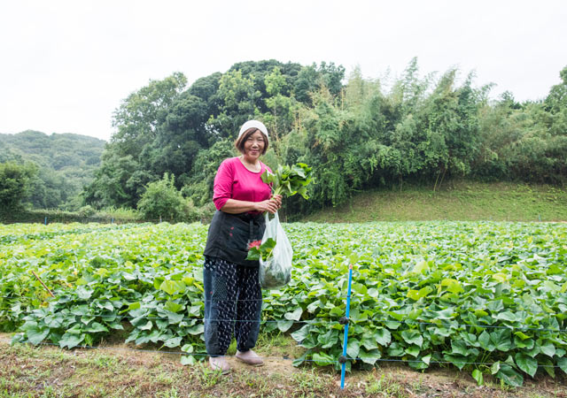 信子さんの車に乗せてもらい10分ほど走ると、緑色の大きな葉っぱがわらわらと見えてきた。湿気を含んだ土の匂いがおいしくて、大きく吸い込む。土の匂いを嗅ぐと落ち着くのは、やはり農耕民族の潜在的な記憶なのだろうか。