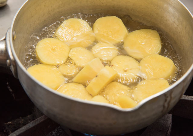 まず皮を厚めにむいた芋を、2センチくらいの輪切りにする。それを鍋に入れ、ひたひたの水を入れ火にかけ、やわらかくなったらザルに上げる。お風呂上がりの赤ちゃんのように、ほわほわ湯気の立つお芋を見ていたら、生唾が。