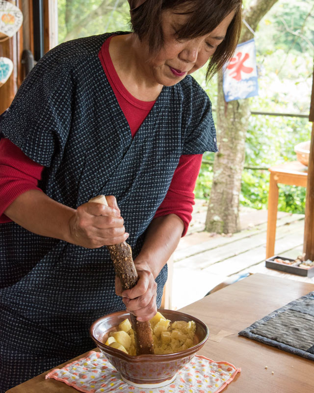 ほくほくのさつまいもを、熱いうちにすり鉢でつぶしていく。