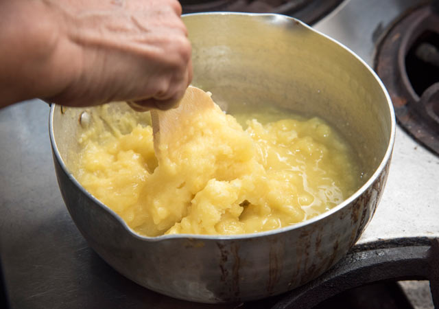 信子さんによると、つぶしたままだと、粒感が残った仕上がりになり、つぶしたあとさらに裏ごしすると、滑らかで上品な仕上がりになるのだそう。
