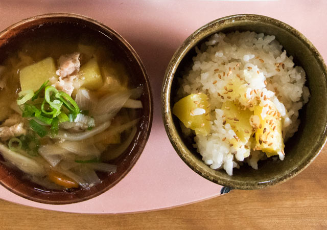 さつまいもご飯に芋づるの佃煮、そしてお父さん特製のお味噌汁。