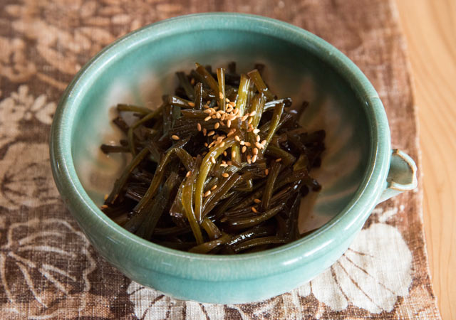 こってりと煮つけられて黒々とした芋づる、見た目はきゃらぶきのよう。