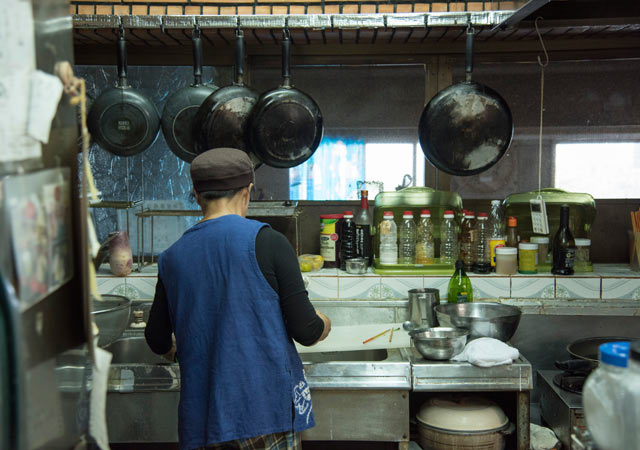 おばあ(おばあちゃんの沖縄呼び)が台所で料理をしている写真、