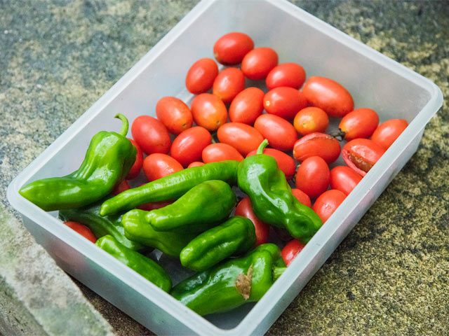 幸さんがおみやげに持たせてくれたお野菜。車内でトマトを頬張りながら「おいしいね、おいしいね」と、みんなで幸せなひとときを味わった。