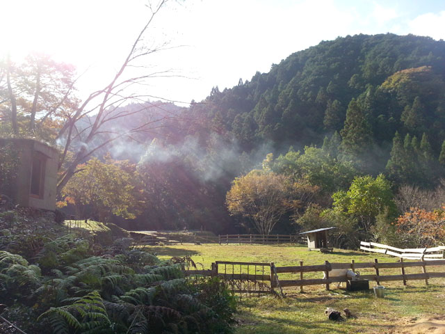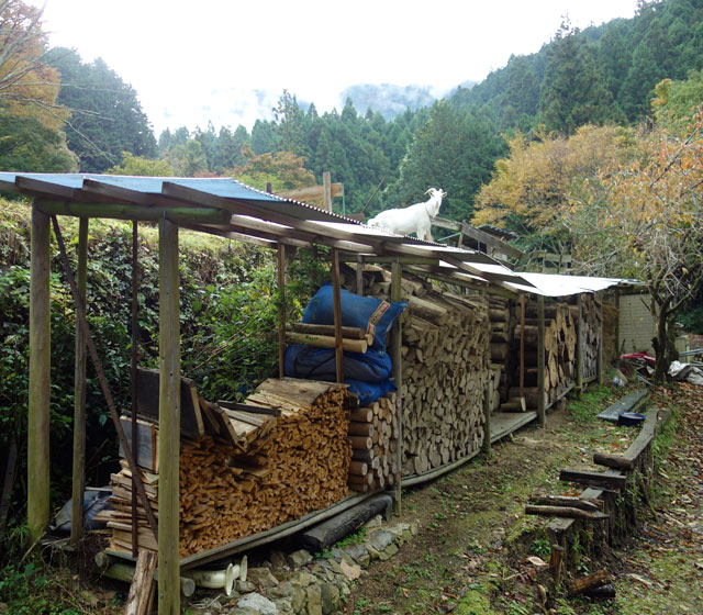 山羊のシロもお出迎え。木々も紅葉しすっかり秋模様。積んである薪がこれからやってくる冬を感じさせます。