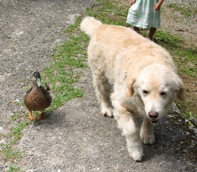 同じく沓沢家の一員、レトリバーのユウと。犬と鴨ってこんなに仲良くなれるものなのかと驚くくらいに仲が良かったふたり。チャチャ死んじゃったねとユウに話しかけたときのなんとも寂しげな表情が忘れられません。(撮影:津留崎徹花)