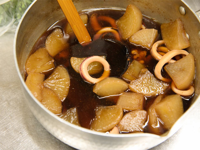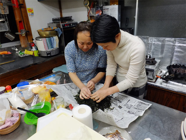 郷土料理に目がない妻はさっそく、女将さんにいろいろと教えてもらっています。