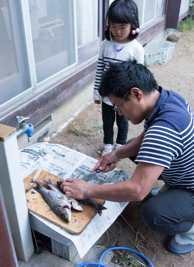 釣り船宿〈兵助屋〉のご主人鈴木俊和さんが、朝釣ったばかりのいさきを持って来てくれました。娘にとって馴染みのない光景。素早くさばかれていく魚たちを、真剣に見守ります。