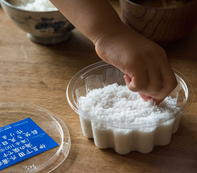 炊きたてのご飯に塩をひと振り、それが娘のお気に入りの食べ方です。村山さんの作るお塩は、〈直農産物直売所旬の里〉などで購入可能です。