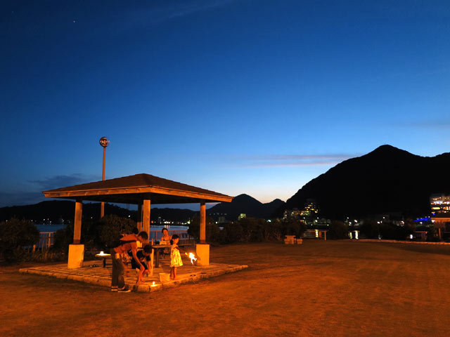 海を臨む広場へ。夕暮れの中、子どもはスイカ割りと花火を楽しみ、大人はビール! 徒歩万歳!