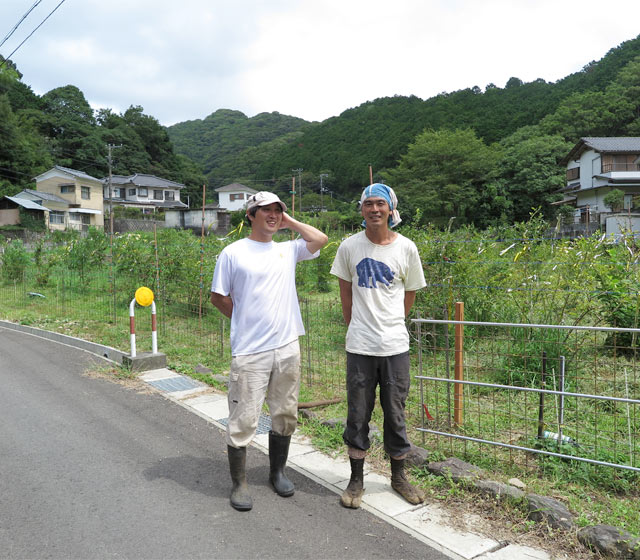 南伊豆米店のスタッフ佐藤兄弟、弟の行さん(左)と 兄の流さん(右)とともに柵づくりをしました。彼らは高橋さんに「人間じゃない……」と言わせるほどの身体能力とタフさを持っています。米づくりから山仕事、大工仕事までできる彼らを見ていると「最近の若者は……」なんて言葉が引っ込んでしまうほど「生きる力」を感じます。