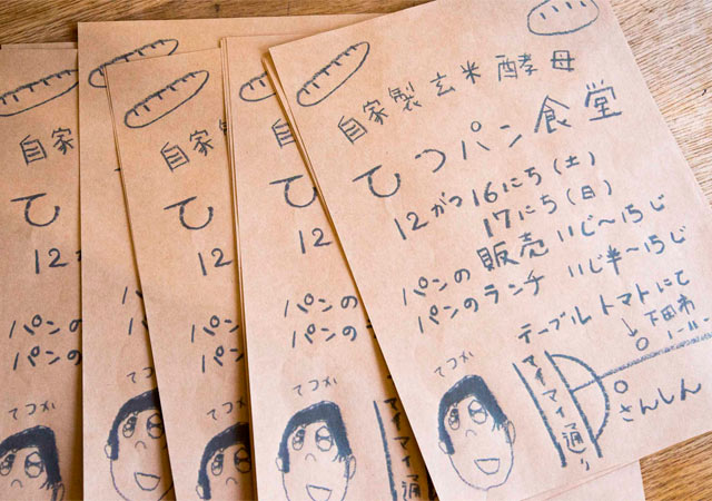イベントのチラシを夫がつくってくれました。夫が文字を、娘が私の似顔絵を、娘の友だちがパンの絵を担当。いい記念になります。