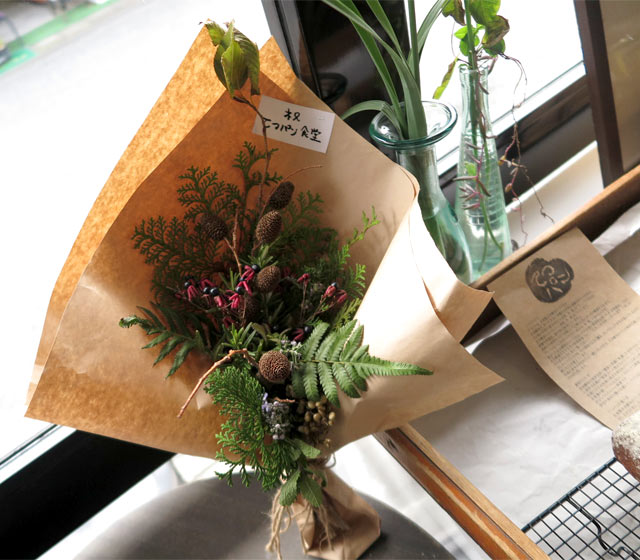 てつパン食堂に来てくれた友人からいただいたお祝いの花束。この花束は、友人がお庭と山で摘んで束ねてくれた手作り。手をかけた贈り物は心にしみます。