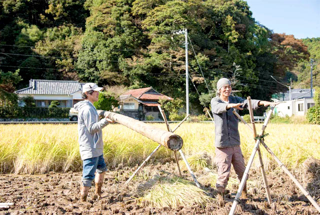 〈大喜米〉の稲刈りイベントにて。大軌さん(右)、鉄兵さん(左)。いまでは地域を代表する若手農家のふたりはともに30代後半の移住者、お互いのよき理解者。大軌さんは地域の人に、「大喜米の大ちゃん」と親しみをこめて呼ばれています。