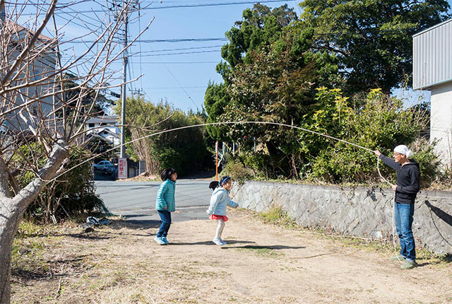 夫と娘が大縄跳びをしていると、たまたま通りがかった友人が合流して、