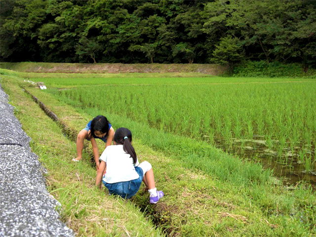 休みの日、家族や友人たちと田んぼへ。田植えから1か月、稲もだいぶたくましくなってきました。子どもたちにとっても田んぼは絶好の遊び場。