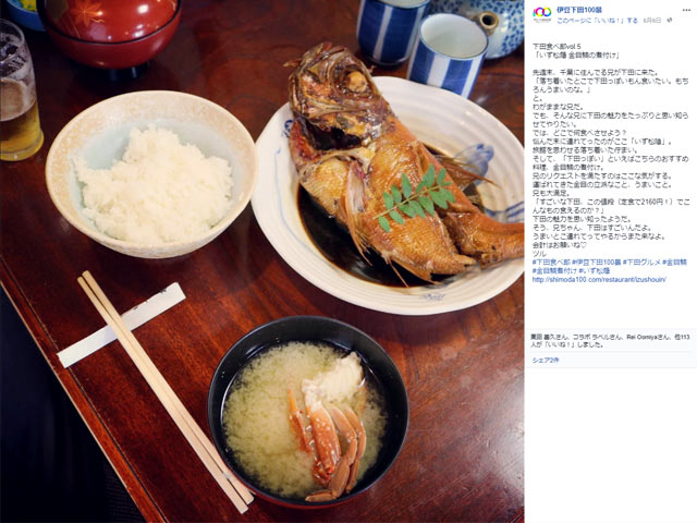 下田の飲食店の食レポをする「下田食べ部」にお誘いいただき活動しております。先日は千葉に住む兄が下田に来た際に一緒に食べた「金目鯛の煮付け」の食レポを投稿しました。