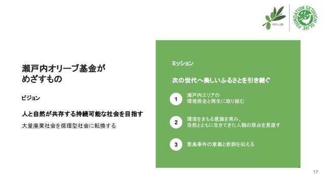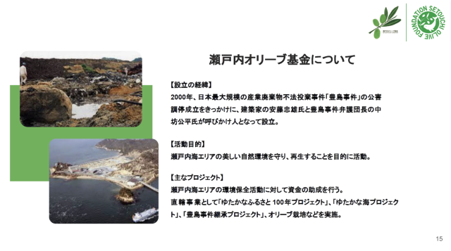 今回のメインテーマである〈瀬戸内オリーブ基金〉は、戦後最大級の不法投棄事件「豊島事件」をきっかけに設立されました。